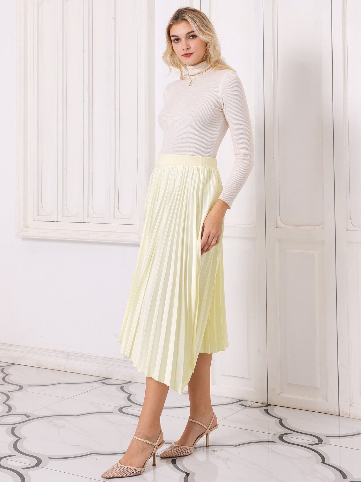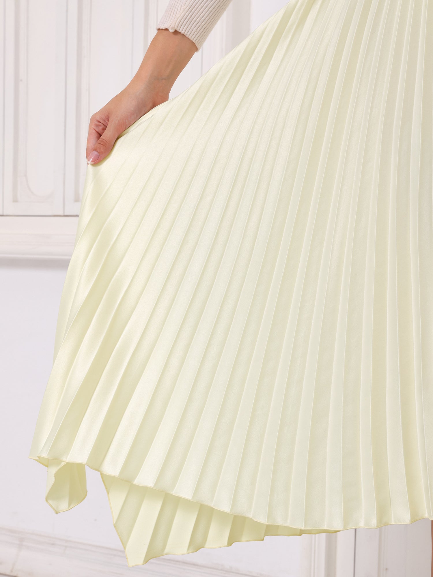 Women's Pleated A-Line Skirt Asymmetrical Hem Satin High Waist Flared Midi Skirt
