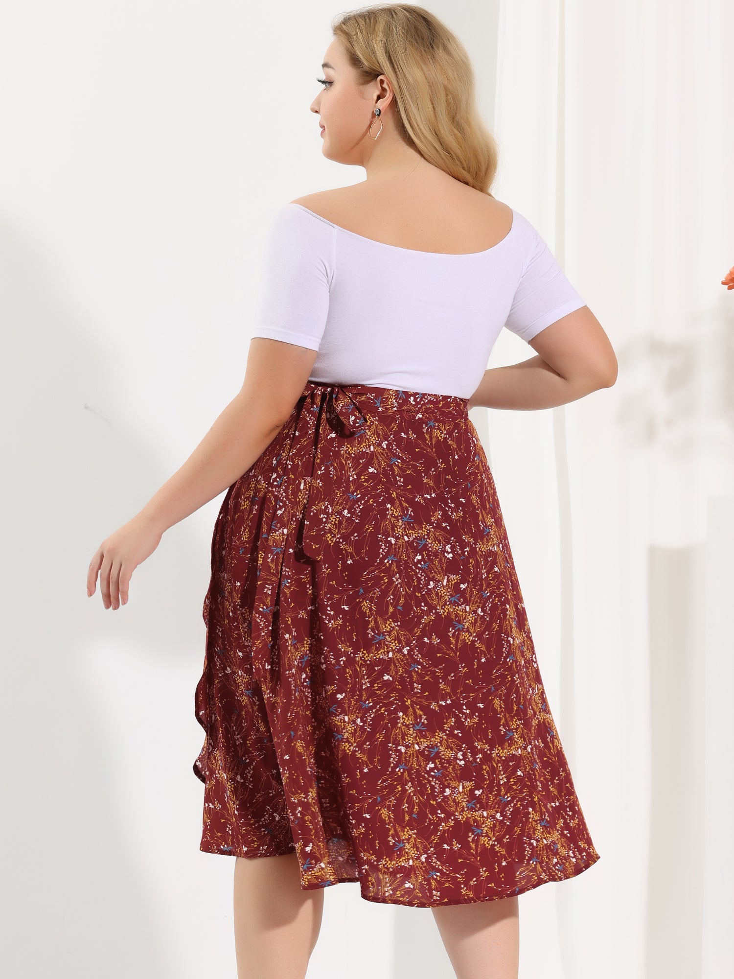 Women's Plus Size Boho Floral Wrap A Line Midi Chic Ruffled Hem High Waisted Skirt