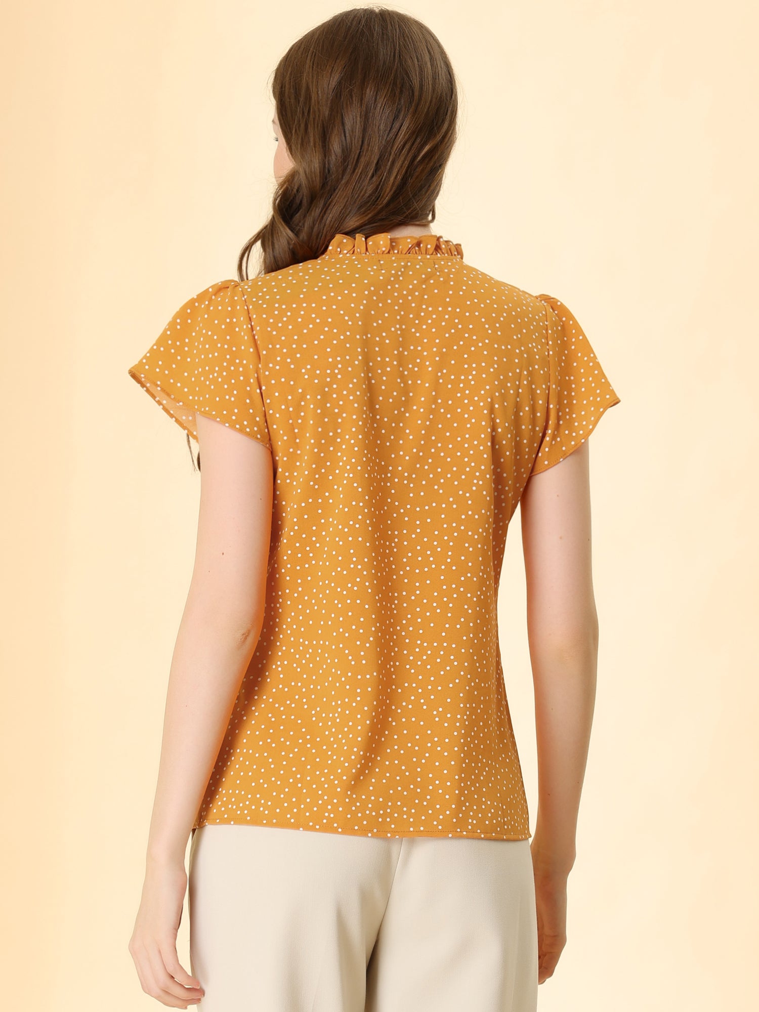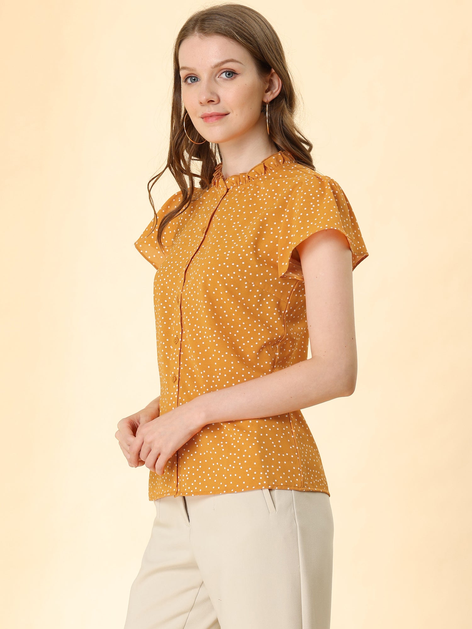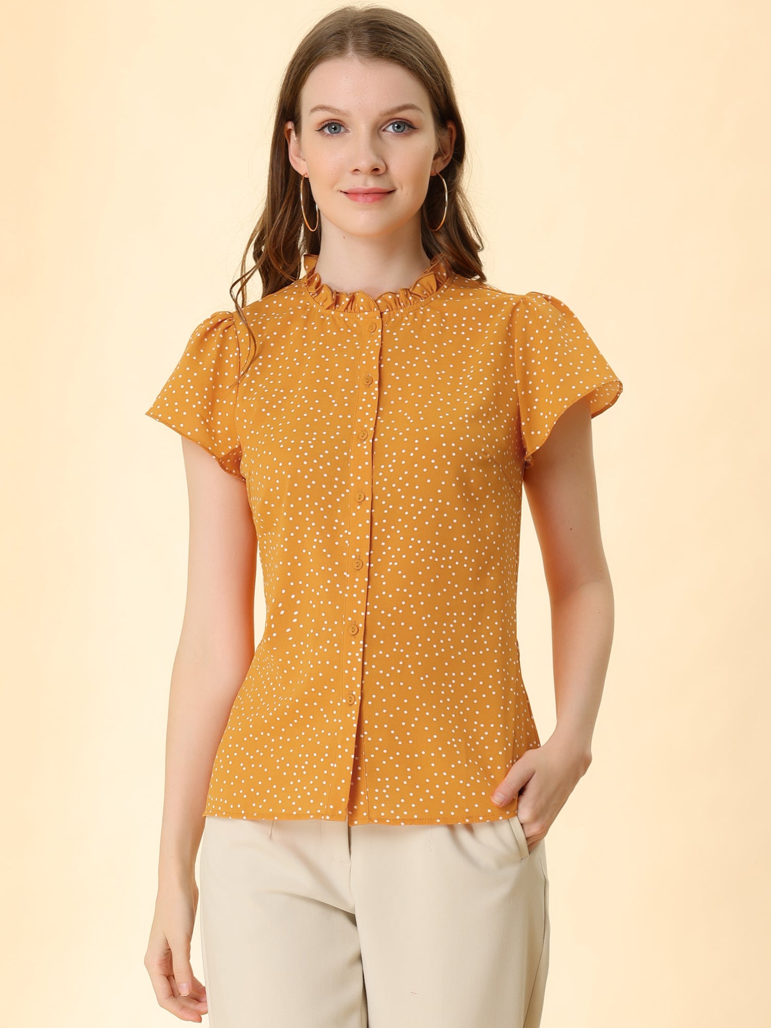 Women's Ruffle Summer Dots Print Retro Short Sleeve Button Down Blouse Top