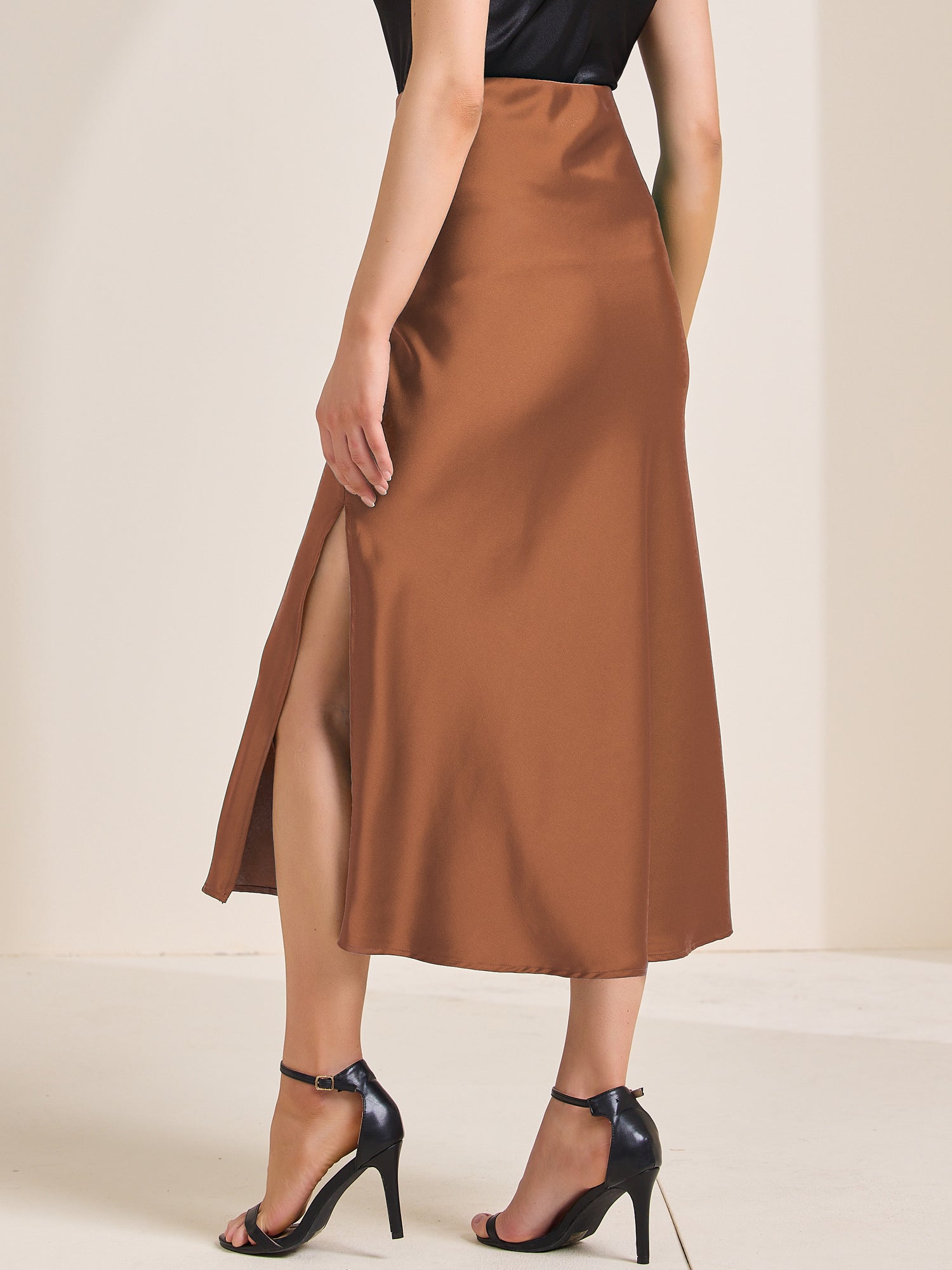 Women's Satin Elastic High Waist Side Slit Elegant Flowy Maxi Skirt