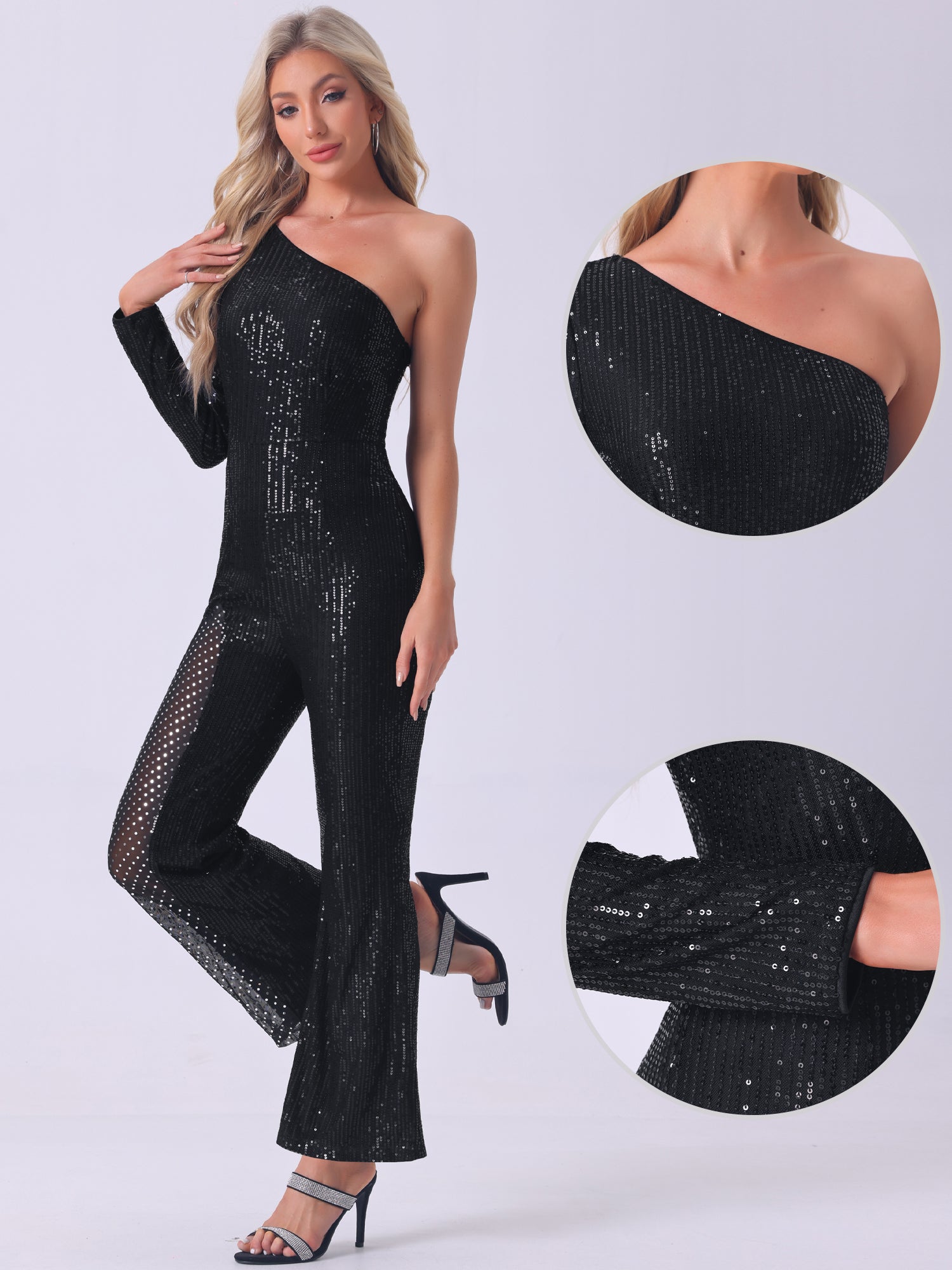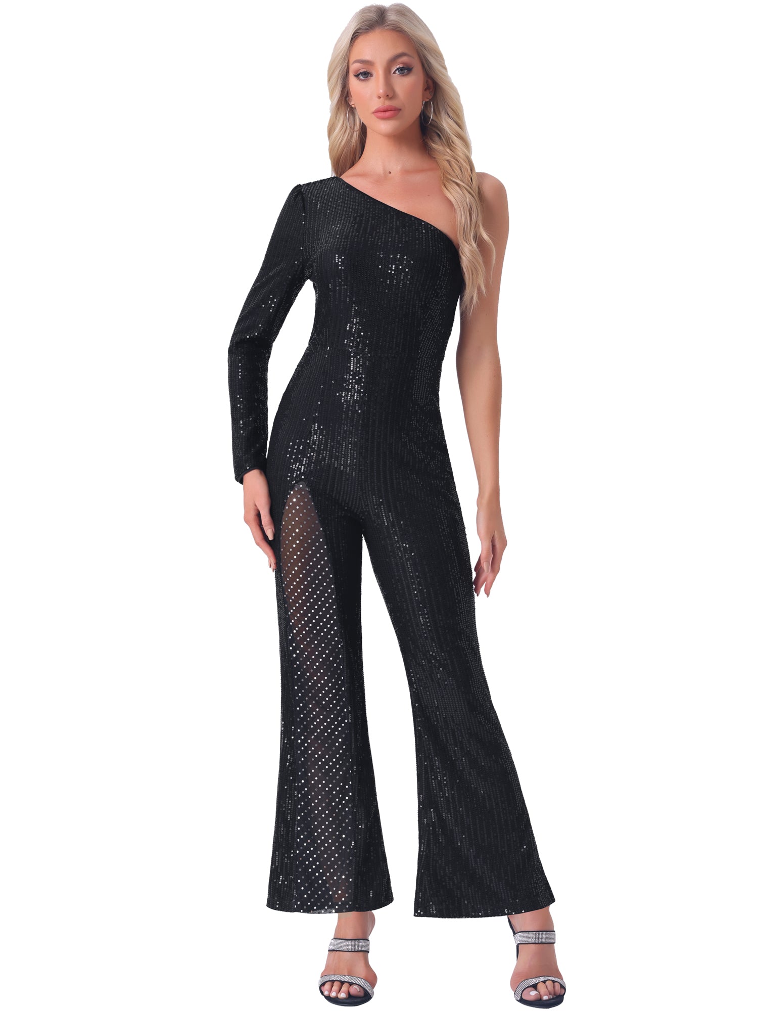 Women's Sequin Jumpsuit One Shoulder See Through Wide Legs Party Romper