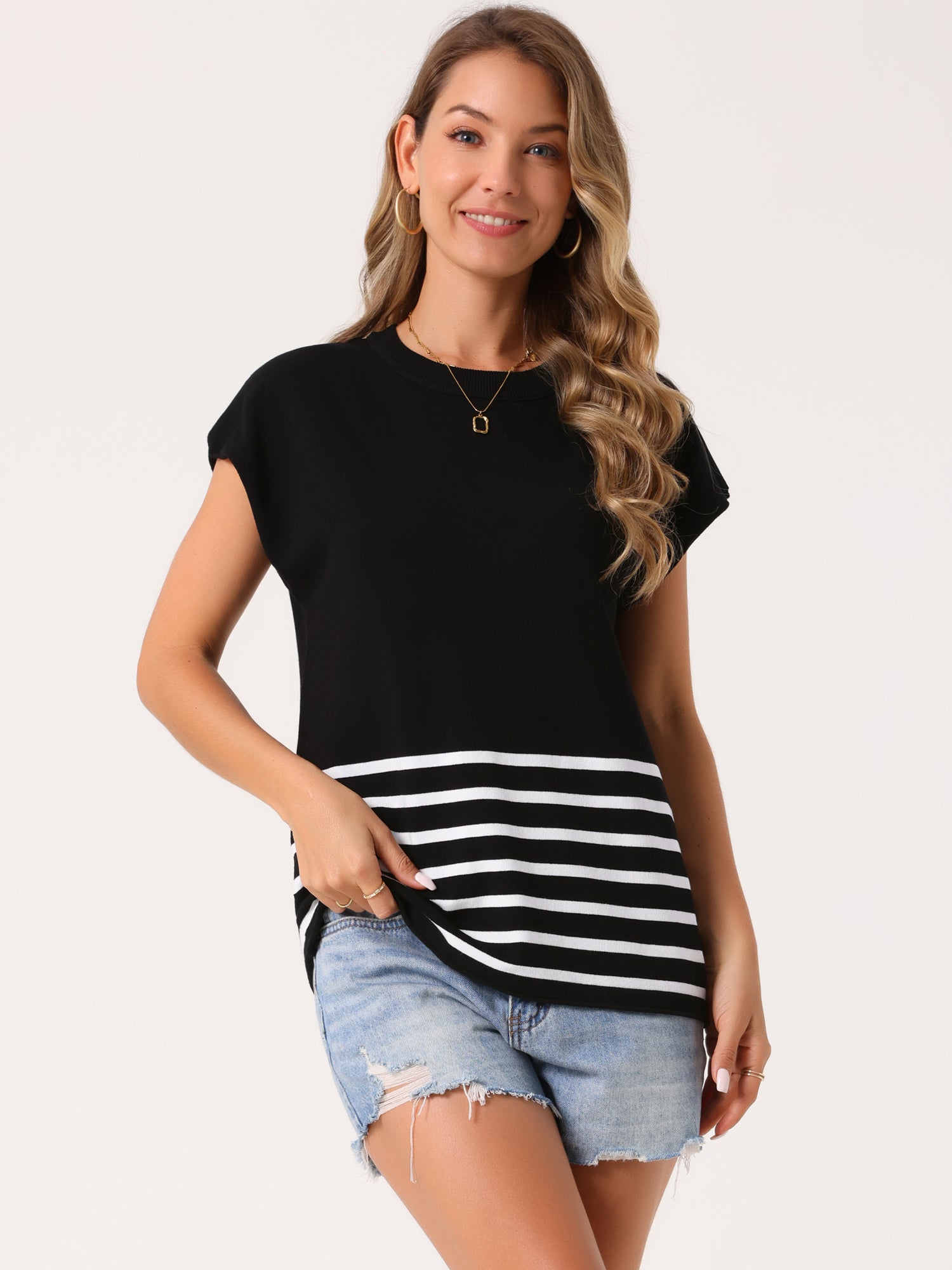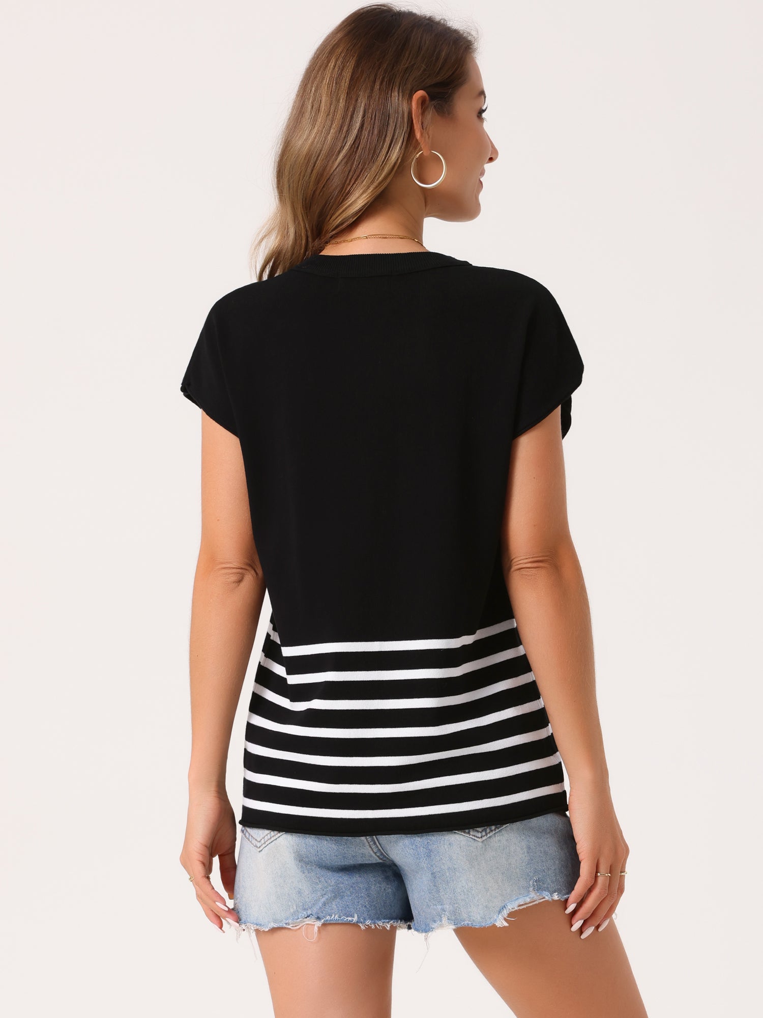 Women's Sleeveless Round Neck Striped Sweater Vest Casual Cap Sleeve Ribbed Knit Pullover Tank Top