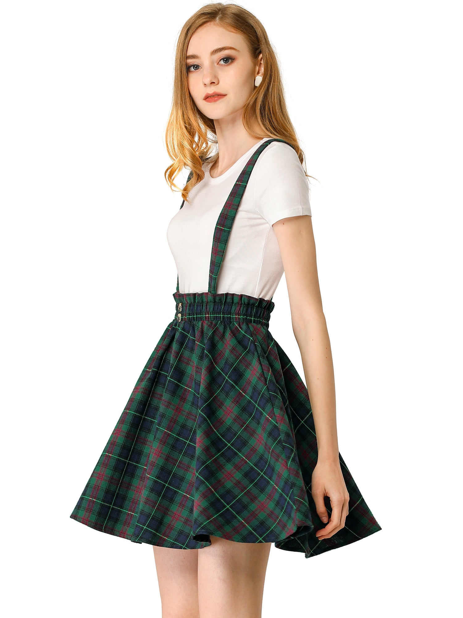 Women's Tartan Plaid Button Decor Flare Skater Suspender Skirt