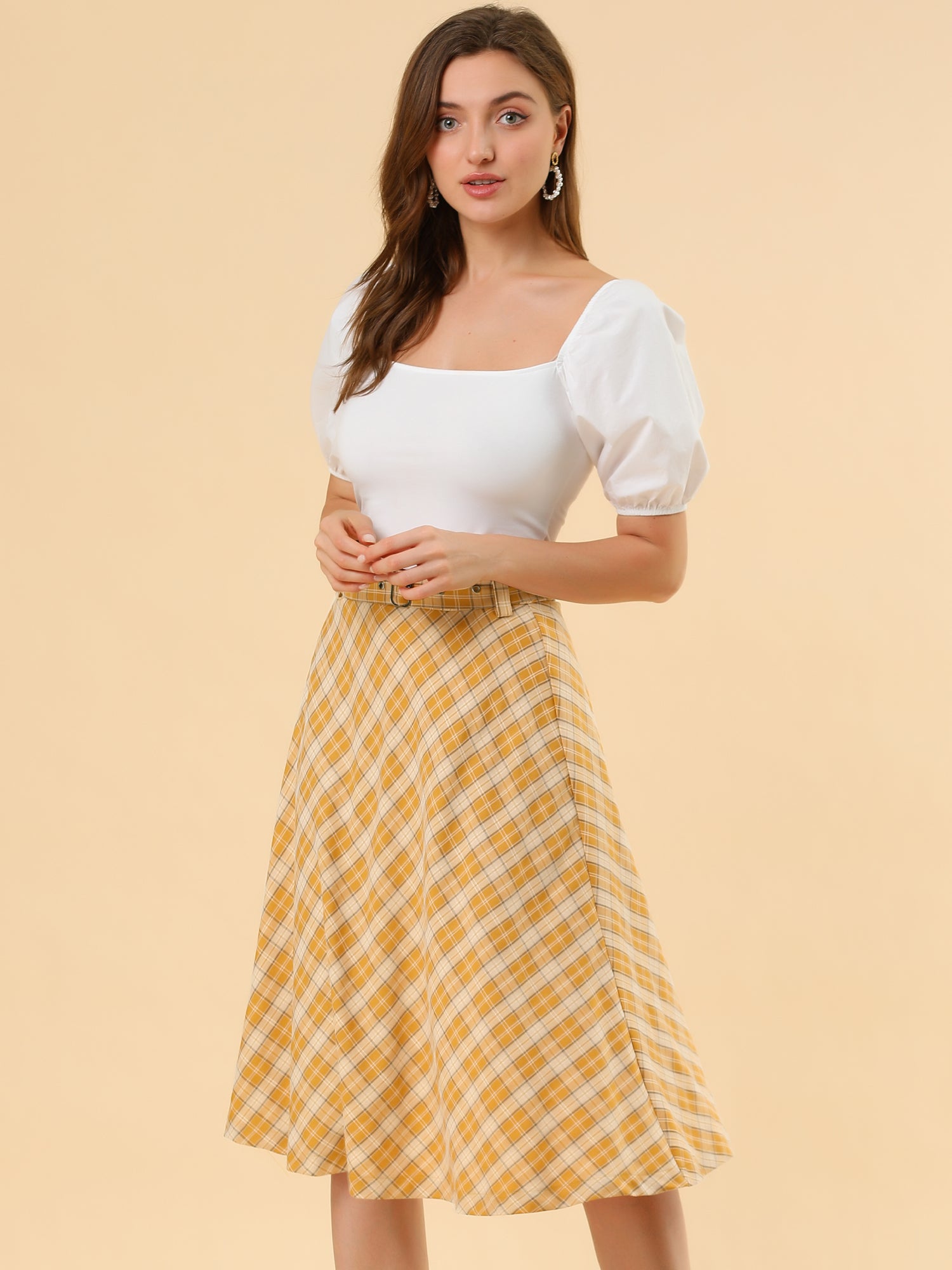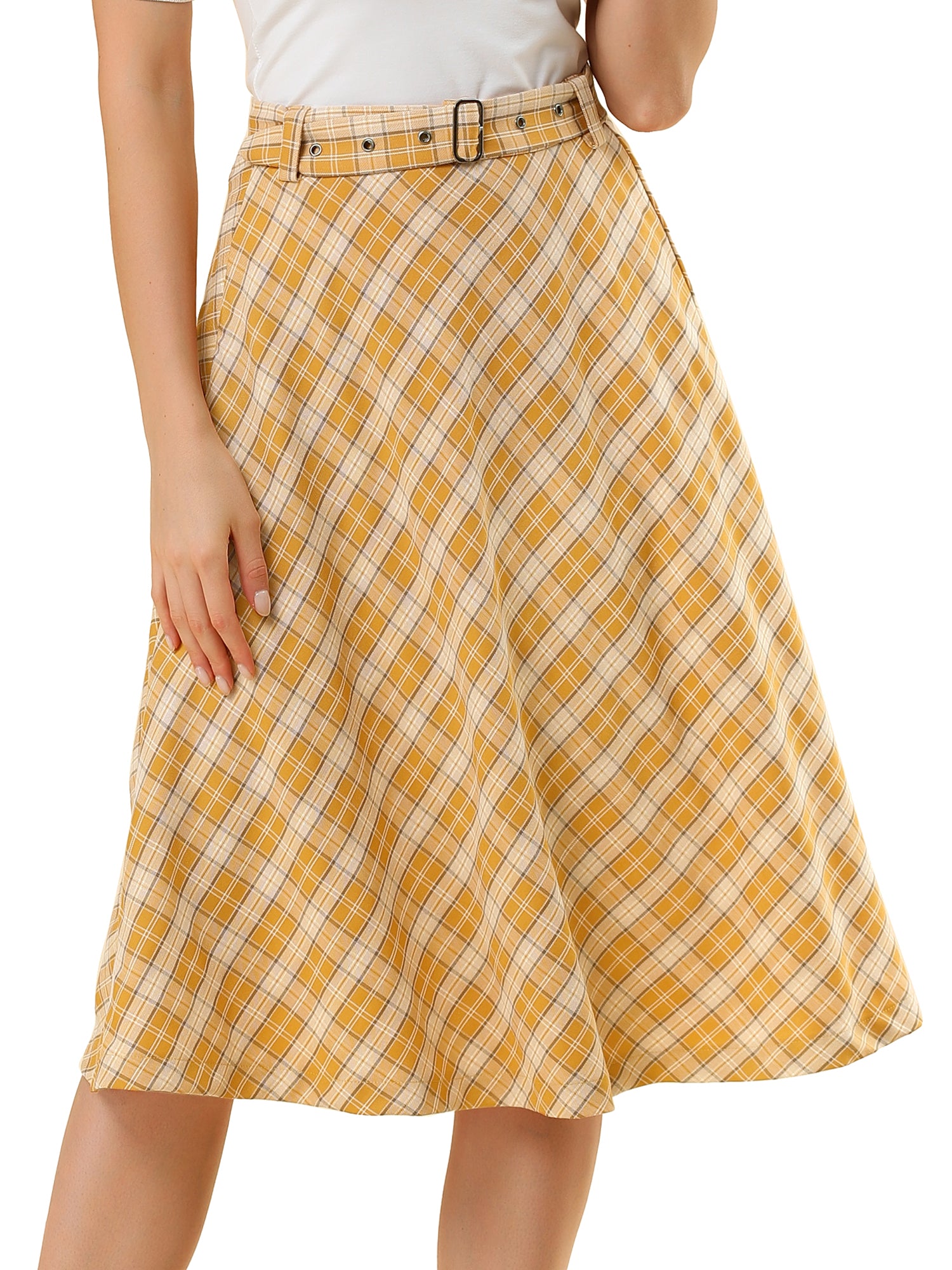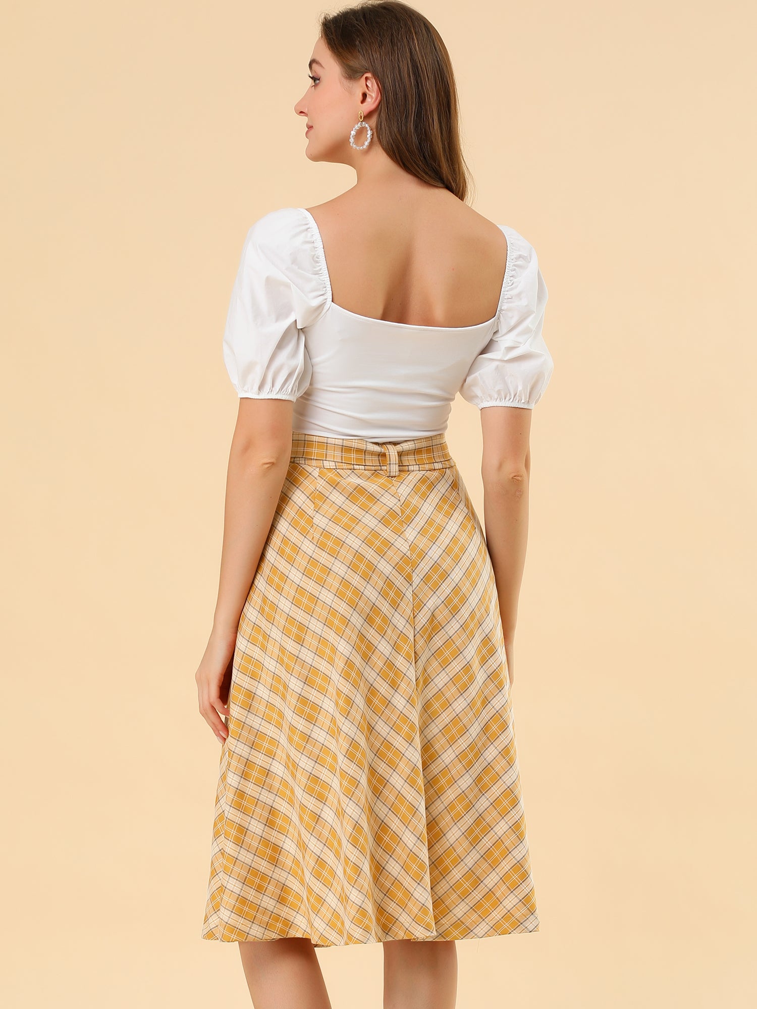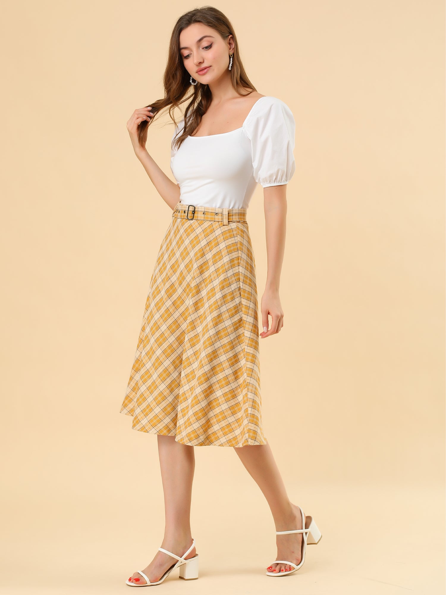 Women's Tartan Plaid High Waist Belted Vintage A-Line Midi Skirt