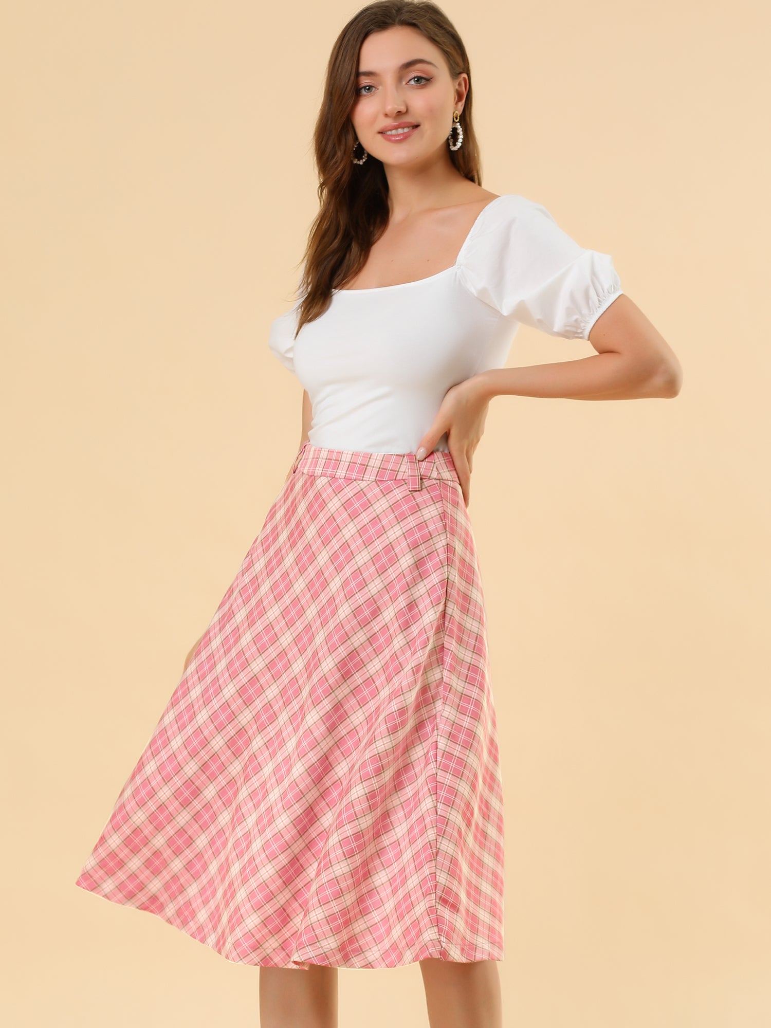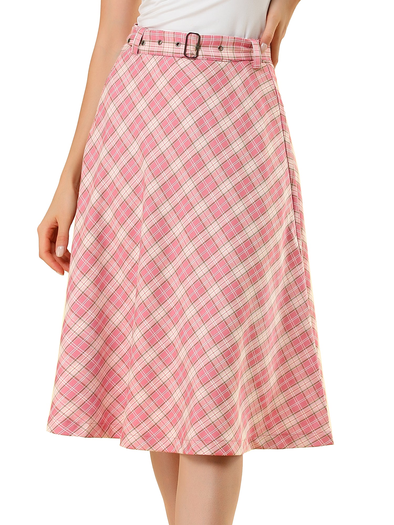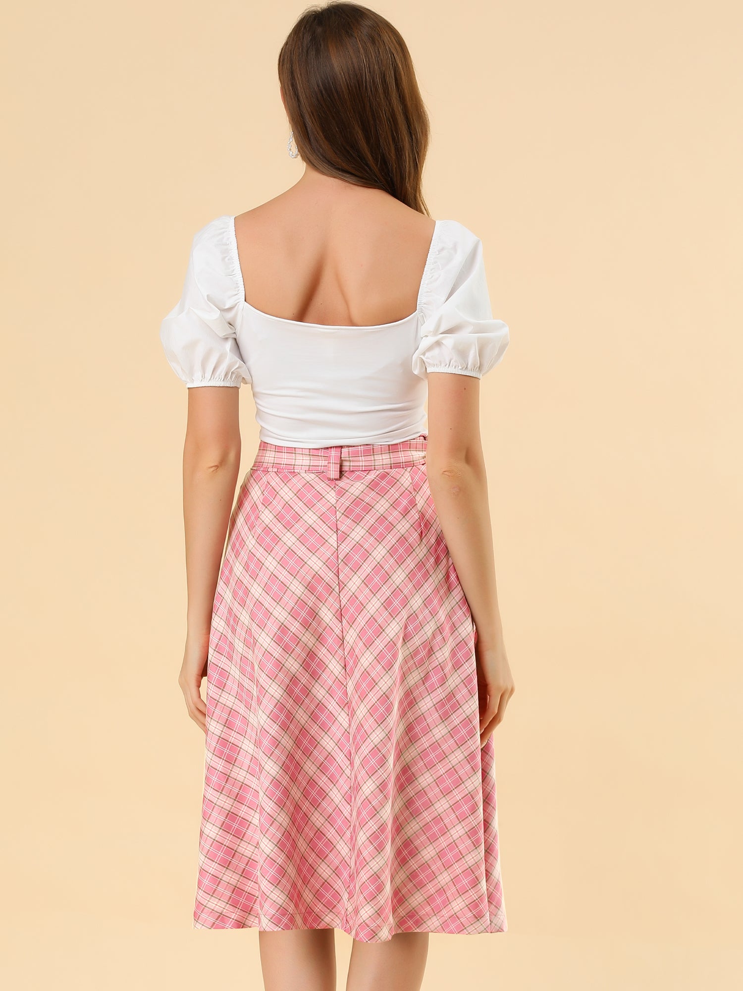 Women's Tartan Plaid High Waist Belted Vintage A-Line Midi Skirt