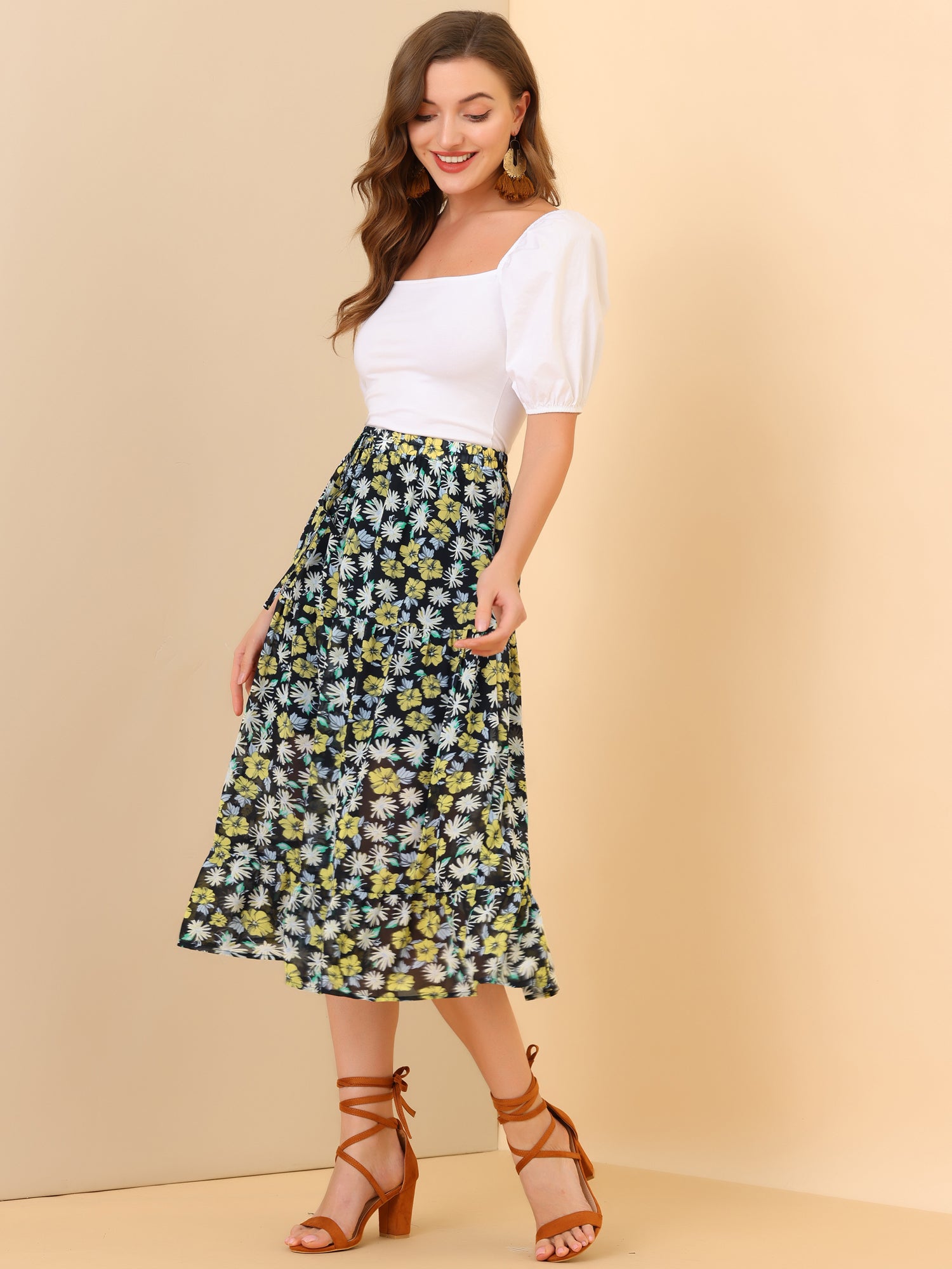 Women's Tiered A-line Flare Swing Elastic Waist Ruffle Floral Skirt