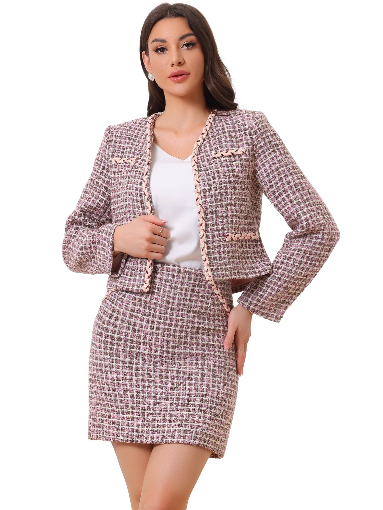 Women's Two Piece Business Tweed Collarless Blazer and Mini Skirt Set